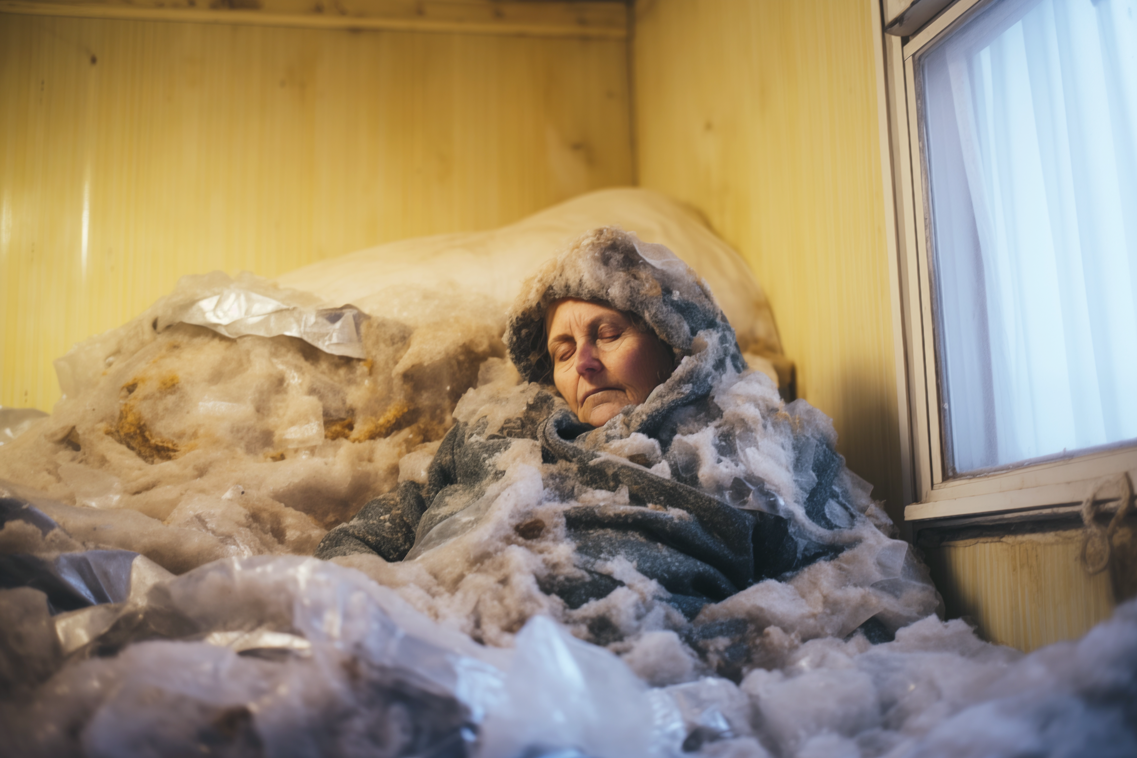 Eigene Darstellung (2023) Meine Großmutter schlafend in Glaswolle. Prompt: my mother lies sleeping in glass wool, 40 years old::2 , shocked and afraid, mother had disappeared, lies in room of unrenovated apartment in glass wool, documentary photography, photorealistic photography, --style raw --ar 3:2