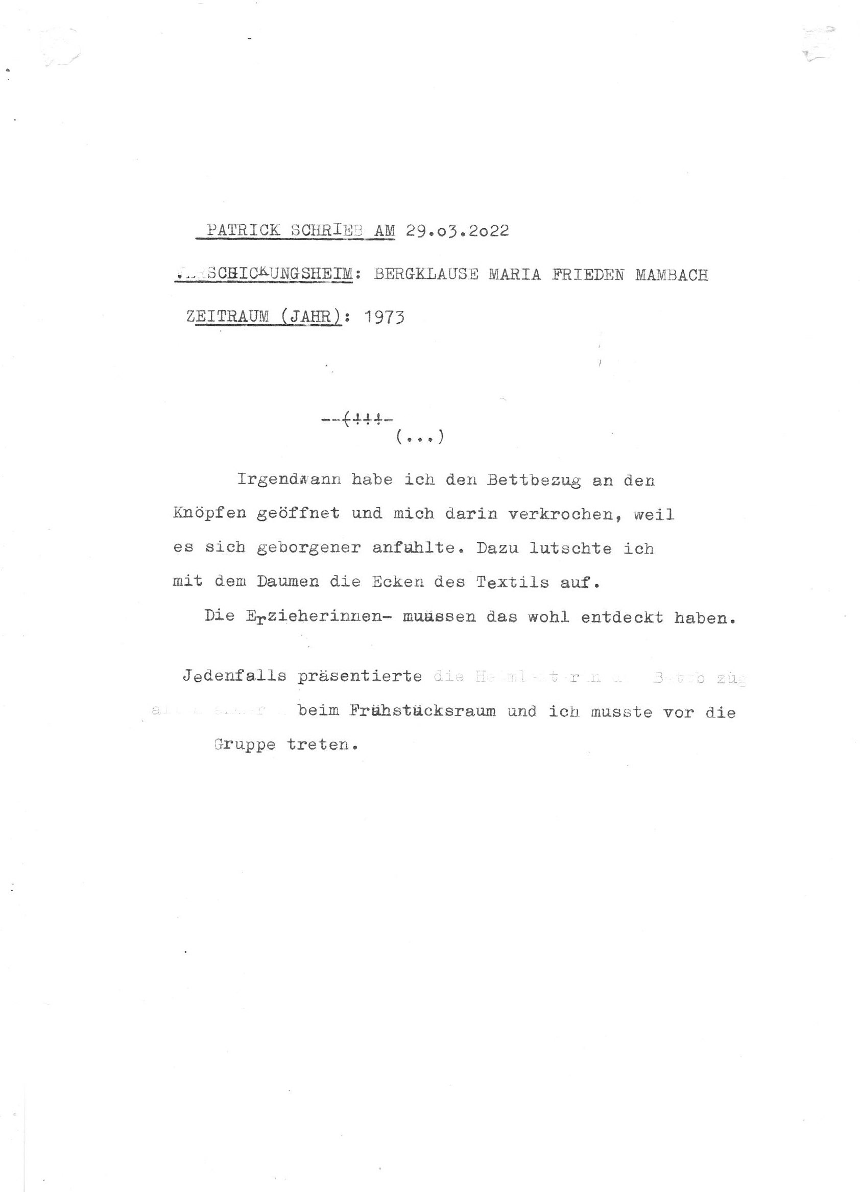 In the last century there were so-called VERSCHICKUNGSKINDER. These children, some of them still infants, were sent for several weeks, months or even years to institutions that were supposed to be beneficial to their health. Coercion, violence and abuse take place there. Years ago, a man who had been in the Niendorf sending home in the 1970s committed suicide and his widow then started a search for other victims, and there are now pages and pages of testimonials from people looking for answers to what happened back then.